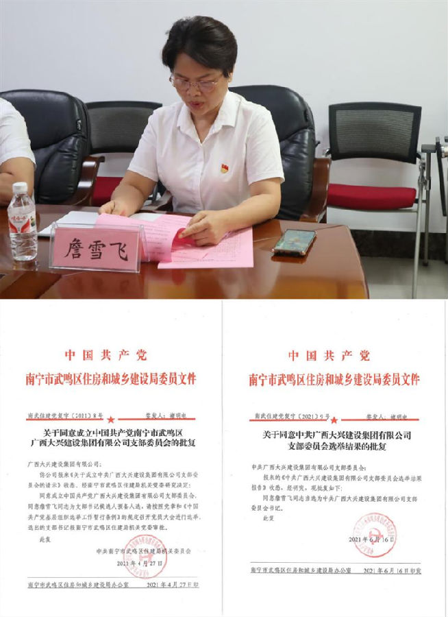 大興集團(tuán)副總經(jīng)理、黨支部書記詹雪飛主持本次揭牌儀式并對大興集團(tuán)黨支部成立進(jìn)行介紹。廣西大興建設(shè)集團(tuán)有限公司于2021年4月21日向城區(qū)住建局黨組織提交成立黨支部的申請,2021年4月27日中共南寧市武鳴區(qū)住房和城鄉(xiāng)建設(shè)局委員會(huì)批復(fù)成立。2021年5月18日選舉黨支部書記,2021年6月16日中共南寧市武鳴區(qū)住房和城鄉(xiāng)建設(shè)局委員會(huì)批復(fù)選舉結(jié)果。